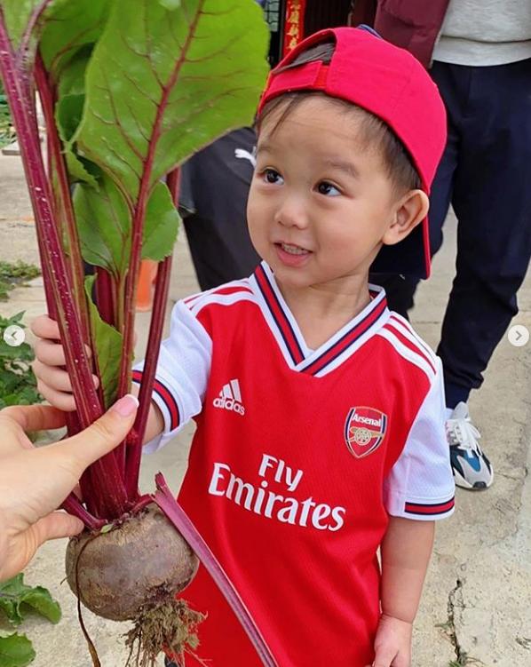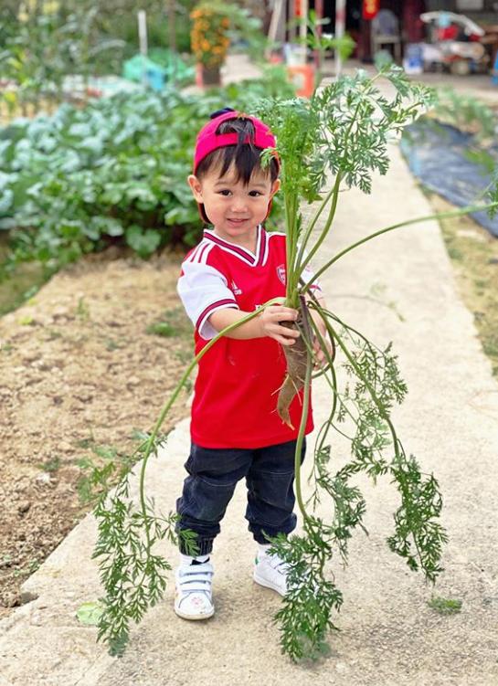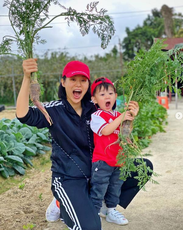 照片中胡杏儿和儿子奕霆戴着同款红色帽子,表情也是神同步。母子俩都拿着自己拔的萝卜开心展示,从尖叫的表情看,真是开心到不能自已啦。而且奕霆似乎还晒黑不少呢,皮肤黝黑黝黑的。