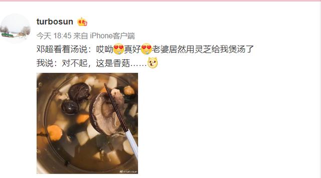 原来孙俪在家炖了汤,邓超看到之后还感叹:“哎哟,真好,老婆居然用灵芝给我煲汤了。”而孙俪却“无情”地回答道:“对不起,这是香菇……”配图是用筷子从锅里夹起的一个香菇。