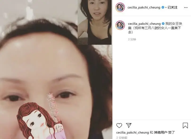 3月8日妇女节,在国外度假的张柏芝发文祝福妈妈戴莎莉节日快乐,她晒出与妈妈一起视频的截图,并写到:“我的女王快乐,祝所有三月八号的女人一直美下去
