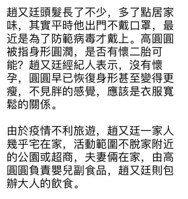 在偶遇赵又廷一家五口之后,记者采访了赵又廷经纪人,指高圆圆身材圆润会否是怀上二胎?经纪人指圆圆并没有怀孕,而且她产后身材比以前更瘦,只是因为衣服的问题令她看起来胖了。