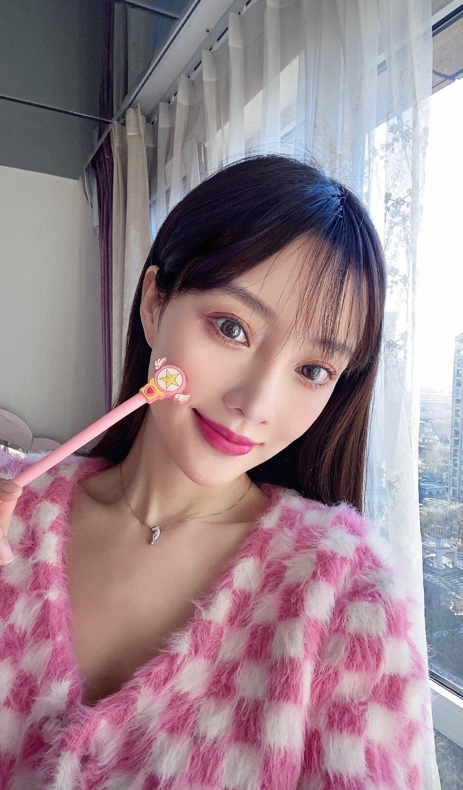 李小璐对镜甜笑,尽显清纯。