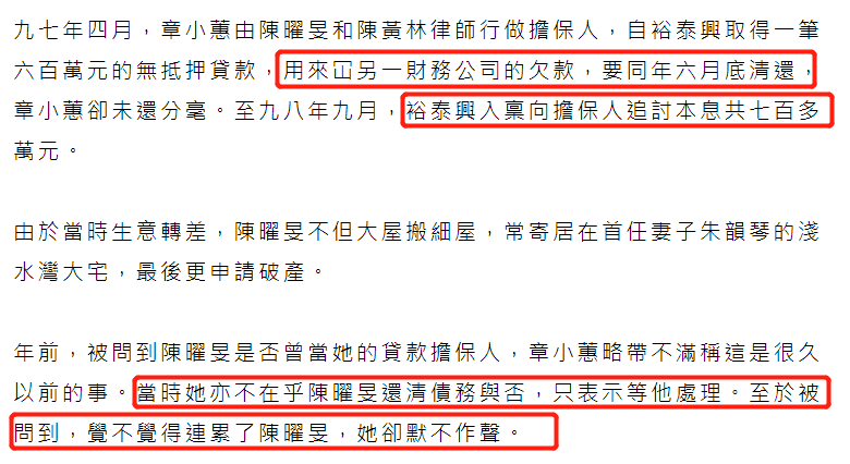 尽管如此,陈曜旻依然非常大胆的给章小蕙做担保,让章小蕙成功贷款六百万,不过最后她并没有还款,以至于陈曜旻被追讨连本带利七百多万,加上当时陈曜旻的生意转差,陈曜旻的情况也是每况愈下。