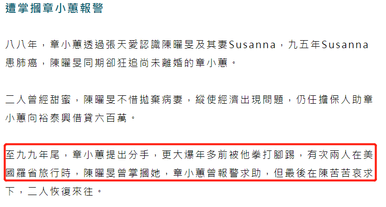 不过在之后章小蕙被问到贷款的事,她却没有丝毫愧疚,并没有觉得自己连累了陈曜旻。后来两人闹分手,也传出章小蕙在旅行时被陈曜旻拳打脚踢,甚至闹到报警处理。