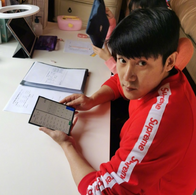 不过更加醒目的是陆毅手里的手机,他双手捧着,非常小心仔细。手机是折叠屏的,看上去就价值不菲。
