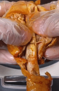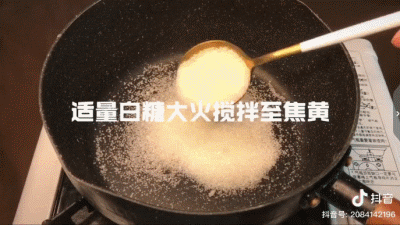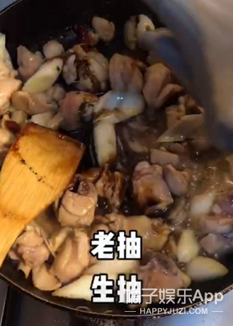 1、油锅里放入冰糖炒化,鸡肉炒至金黄色。