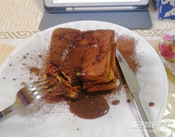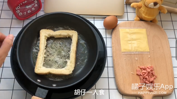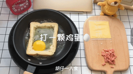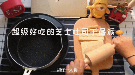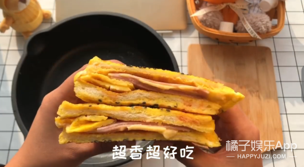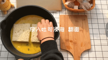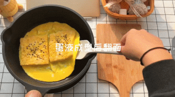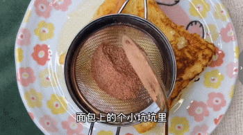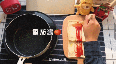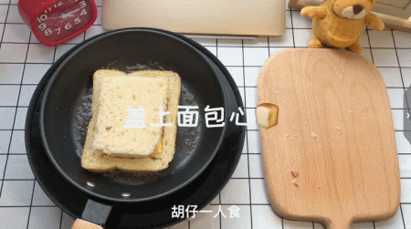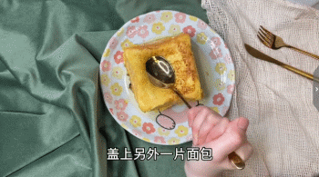 等另一面煎至金黄后翻面,面包心完美贴合。