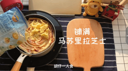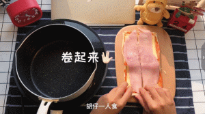 4、成型后翻面,放入你喜欢吃的火腿片、芝士等。