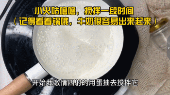 1、把淀粉牛奶白糖倒锅里小火搅拌着煮,