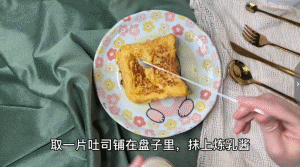 4、给吐司抹上炼乳酱,加片芝士再抹点。