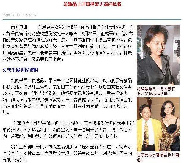 原因是,刘家良怀疑翁静晶与她的上司兼好友林竞业律师存在暧昧关系。此事还牵扯到了一宗命案。