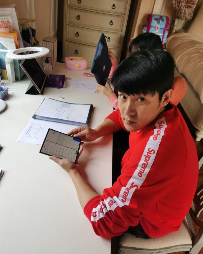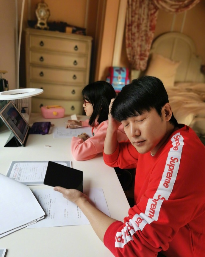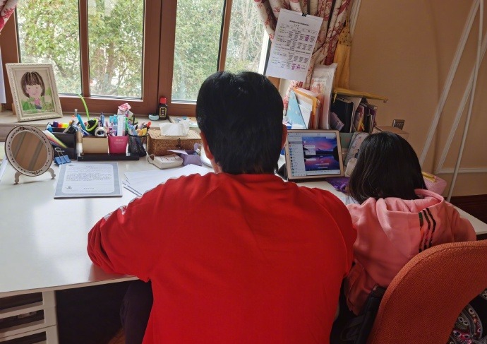 照片中陆毅身穿红色运动上衣,坐在书桌前陪女儿上网课,贝儿戴着眼镜十分专注地写着作业,父女俩背影十分有爱,画面温馨。