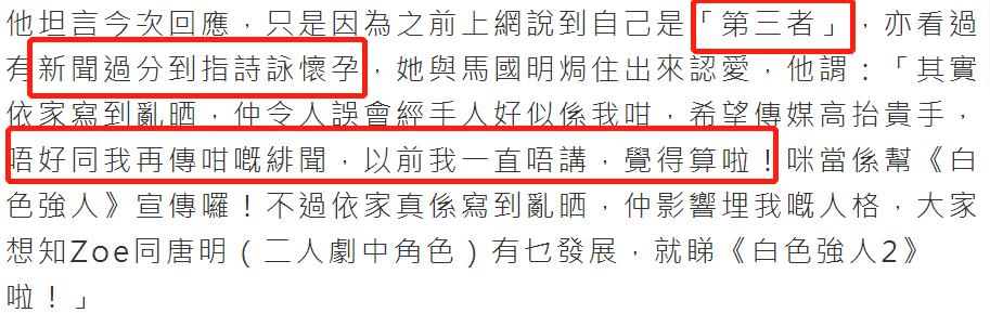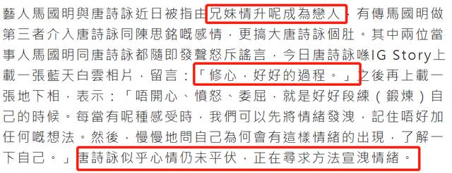 另外就是关于马国明第三者插足感情的传闻,根据平常唐诗咏的不回应政策,这次虽然没有回应关于两人的关系,但也从她发文的字里行间来看,两人疑似可能确实有了进展,但因为最近的传闻,唐诗咏是放弃还是坚持仍然是一个未知。