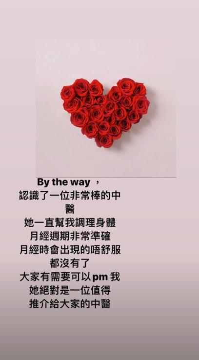 其次就是关于自己怀孕大肚子的传闻,她并表示认识了一个好中医,一直帮着自己调理身体,所以月经周期都很准确,也就是从侧面否认了关于自己怀孕。