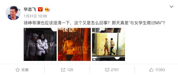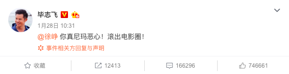 紧接着,毕志飞莫名其妙直接辱骂徐峥,让他滚出电影圈。