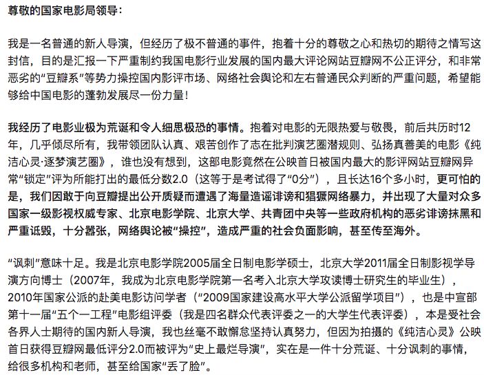 他给国家电影局写公开信,以自己是“被官方认可”的导演为理由,绑架豆瓣是“行业毒瘤”。