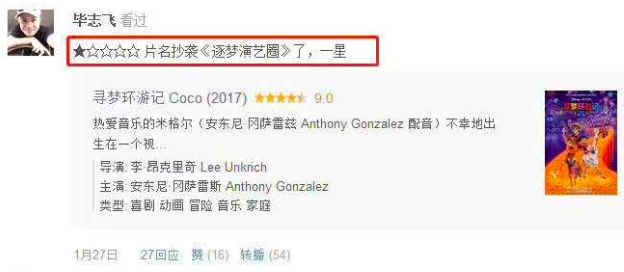 他曾给《寻梦幻游记》打了一星,原因是片名抄袭《逐梦演艺圈》。
