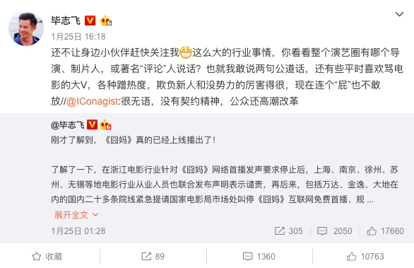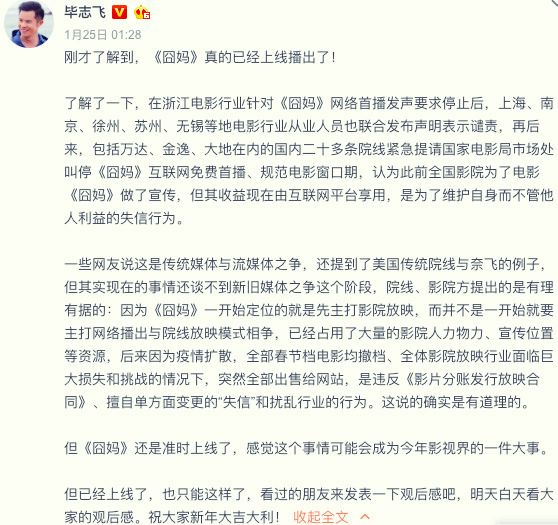 先是深夜发了一段不痛不痒的文字,用的都是网络上现成的内容,文末表示既然电影已经上线了,那就好好吃瓜。