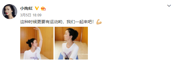 3月6日,陶虹在个人社交平台上分享自己的宅家日常,晒出两张做瑜伽的照片,并配文:“这种时候更要有运动哟,我们一起来吧”。