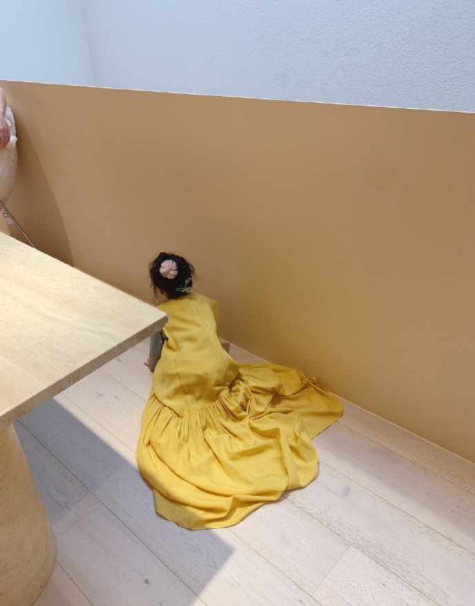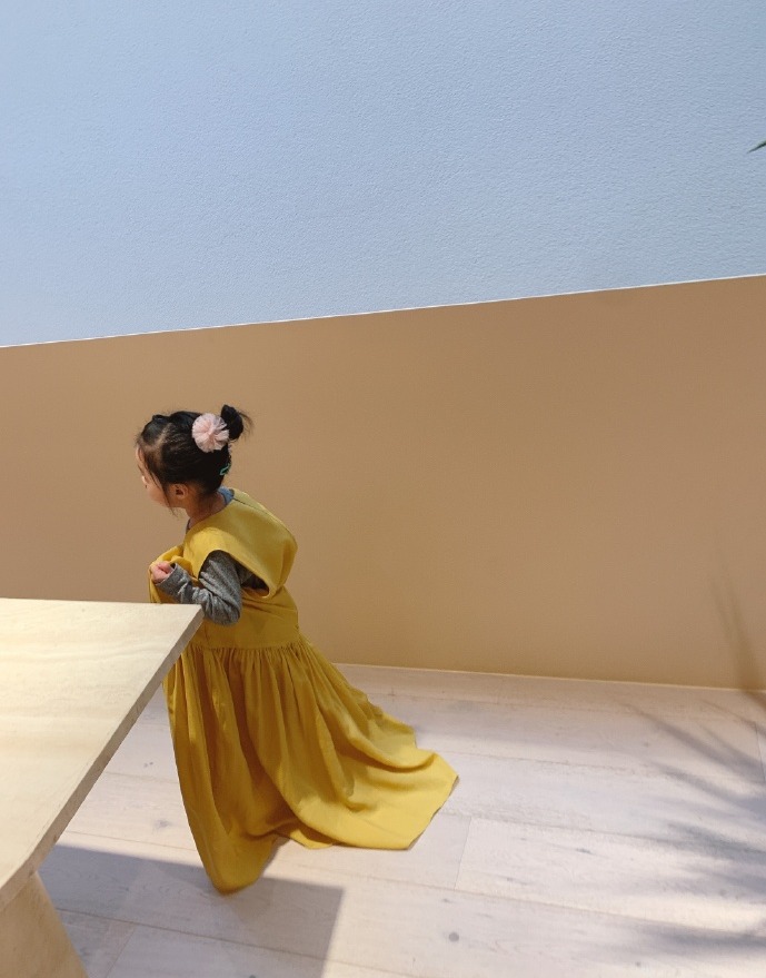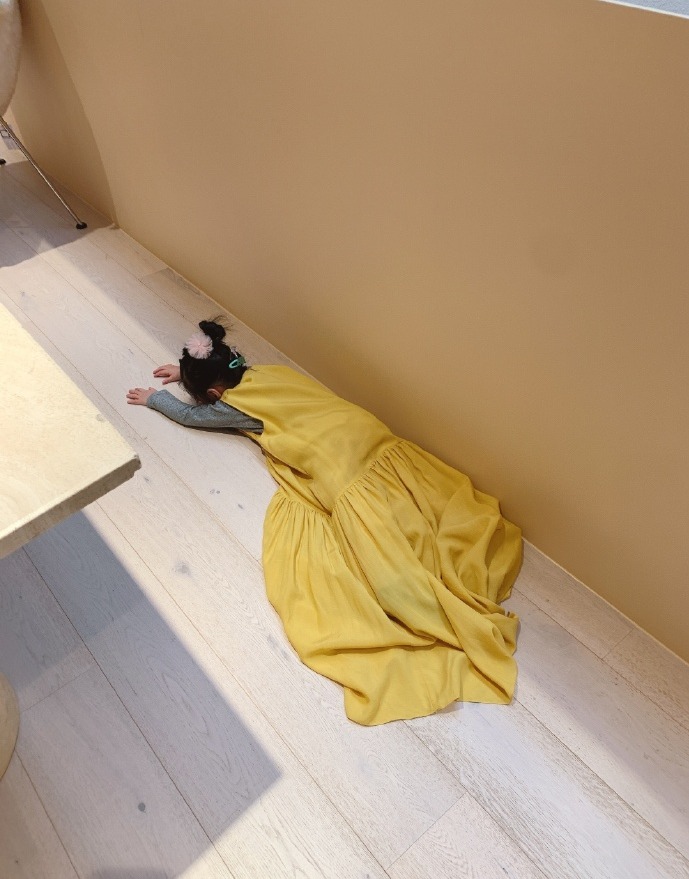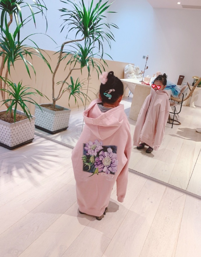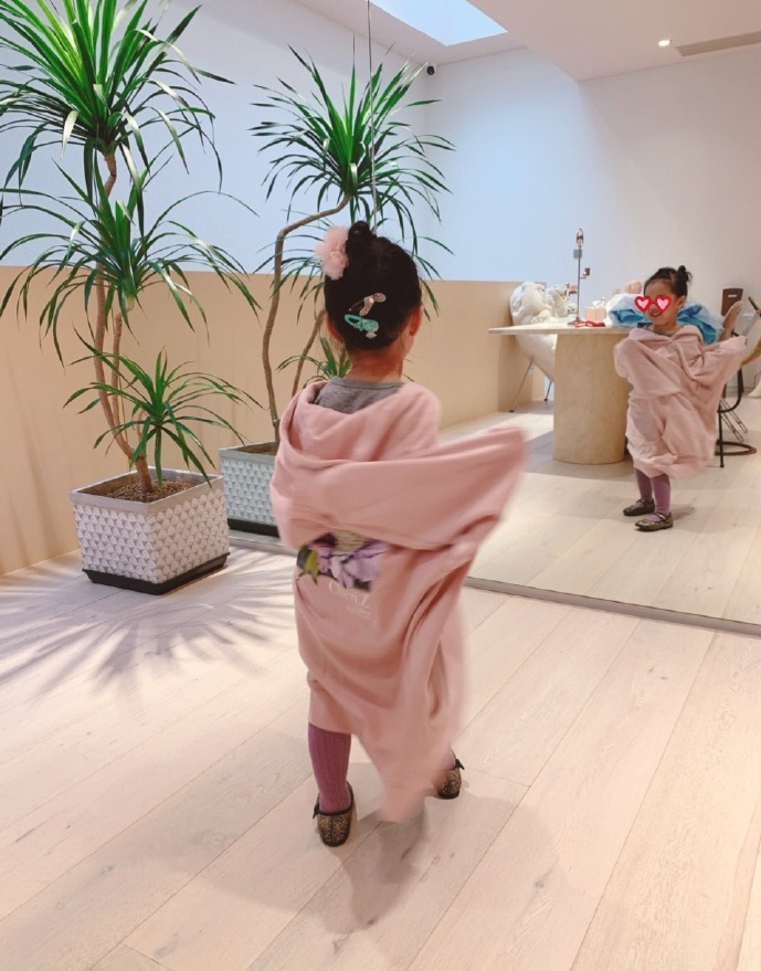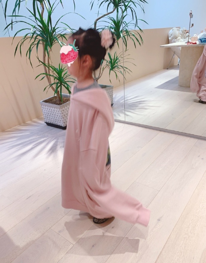 照片中,安安扎着丸子头可爱俏皮,穿着大人卫衣和连衣裙来回跑动,衣服长到拖地,十分活泼。