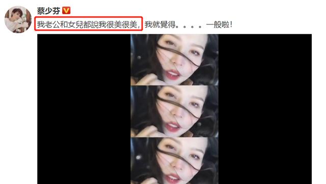 至于生三胎后容颜衰老,蔡少芬也自己晒出视频“反击”,还甜蜜表示:“我老公和女儿都说我很美很美我就觉得…一般般啦!“