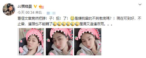 配文中,贾晓晨解释了自己扶着脖子的原因,她说:“看个文章竟然把脖!子!扭!了!是嫌我晕的不够彻底吗?现在可到(倒)好,不止晕,连头也不能转了,屋漏又逢连夜雨……”语气颇为无奈。