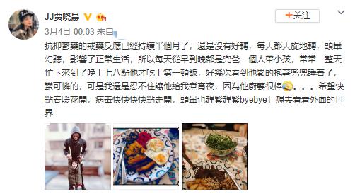 3月4号,贾晓晨表示戒药反应持续了半个月仍然没有好转,头晕幻听现象已经影响了自己的生活。