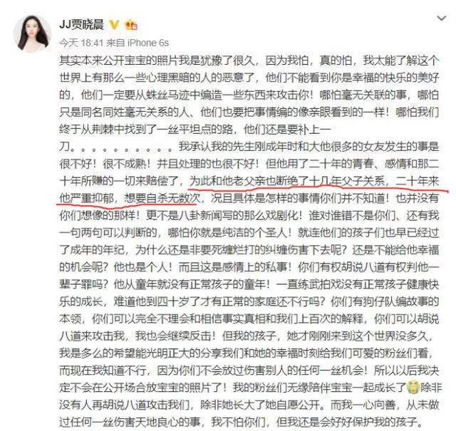 之后,贾晓晨发表长文维护女儿和丈夫。文章中,贾晓晨表示,樊少皇曾因那段感情和父亲断绝了十几年的父子关系,二十年来严重抑郁,多次有轻生的念头。