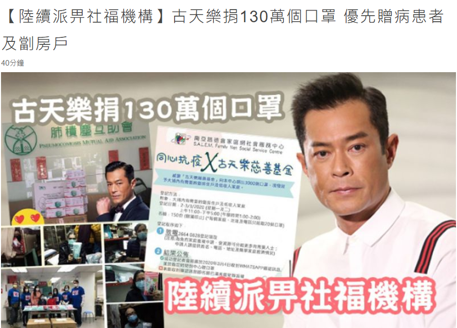 目前口罩的派发工作在有序的进行,未来将会有更多的人收到古天乐捐助的口罩。在此之前,古天乐捐款的消息也引起不少人的关注。