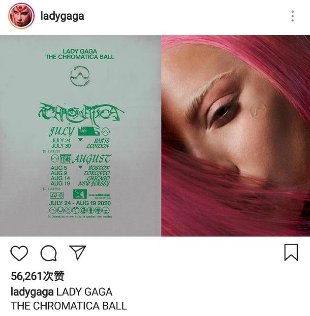 3月5日,Lady Gaga在个人社交网站宣布开启“The Chromatica Ball”全球巡演,首站将于7月24日在巴黎开启。