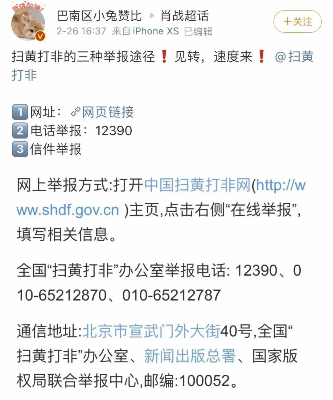 目前微博用户巴南区小兔赞比已删除了除道歉外的所有微博内容。 不过其当时呼吁举报的发言被网友截图留存了下来。