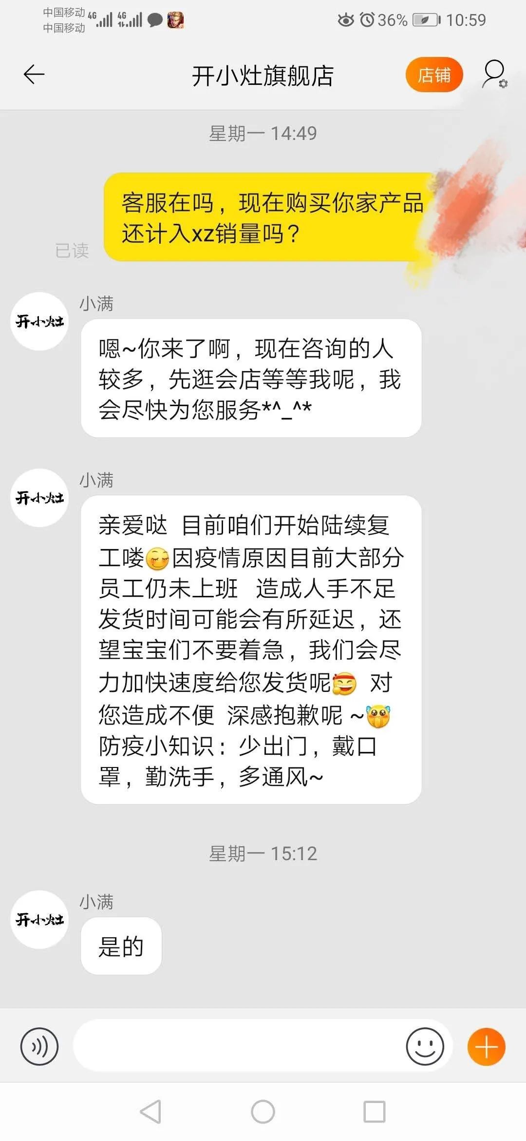 记者咨询开小灶天猫客服后得到的回复。
