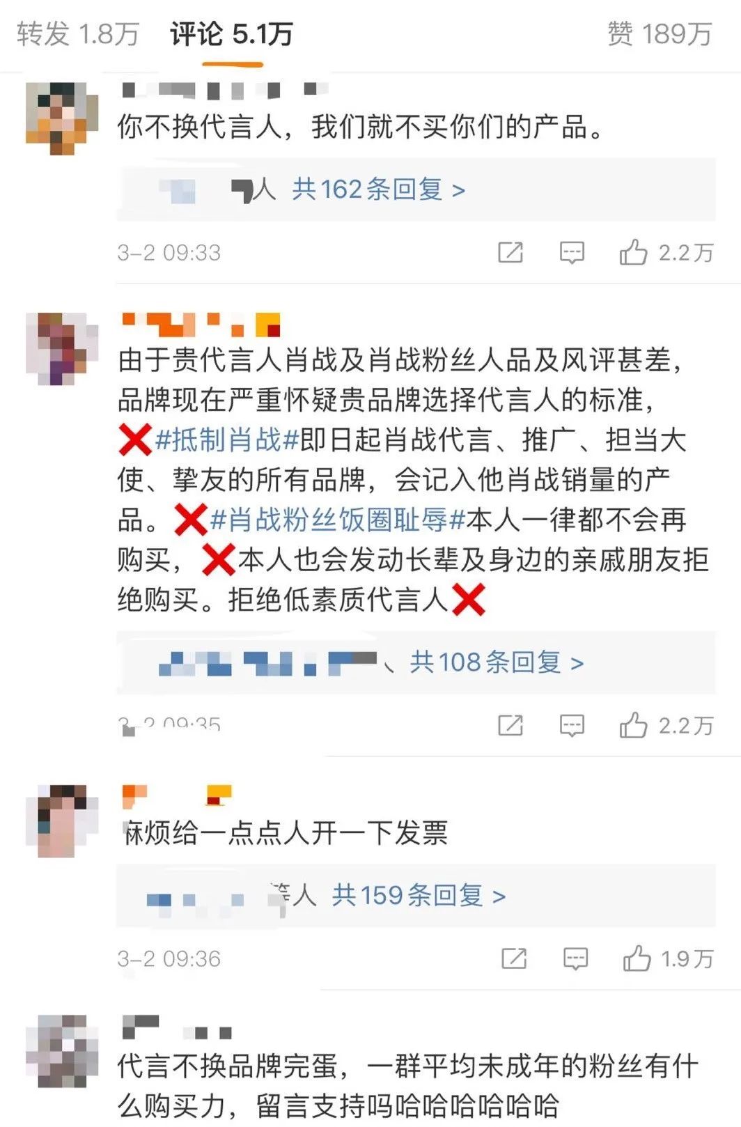 随着事情不断发酵,愤怒的网友开始将矛头对准肖战的商务代言。3月1日,微博话题#抵制肖战#冲上热搜,不少网友列出了肖战代言的全线产品名单,并表示“不会购买任何肖战代言、担任大使、记肖战销量的产品”。随后,各大品牌的社交媒体账号被“抵制肖战”的呼声刷屏,在电商平台购买过肖战相关产品的人纷纷要求退货。随后,主播李佳琦在3月1日晚间的直播中,临时撤下了一款由肖战代言的Olay产品。