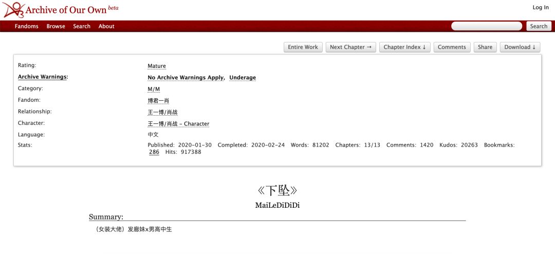 谁能料到,正是一篇“博君一肖”同人文,引爆了肖战粉丝内部的一场争斗,并最终波及了整个亚文化圈层。2月24日,用户@迪迪出逃记 在微博写到,她在AO3和LOFTER(AO3全称为Archieve of our own,是世界上最大的同人小说数据库之一,LOFTER则由网易出品,是中国最大的同人创作社区)发布了同人文《下坠》的最新连载。在这个故事中,肖战被设定为患有性别认知障碍的发廊女,王一博是与之恋爱的高中生。