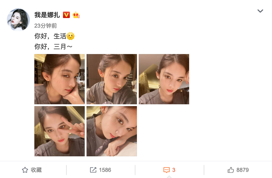 "3月4日,古力娜扎在微博一组自拍照迎接三"娜扎穿着灰色的卫衣,戴着精致的长耳坠,一会儿比v,一会儿又撑着脸,pose百变。"娜扎妆容精致。"娜扎比V摆pose。"娜扎晒自拍。"娜扎晒自拍。609微信扫一扫复制下方链接,去粘贴给好友吧-娜扎晒自拍喜迎3月 戴精致长耳坠pose百变复制链接本文由网络整理 © 版权归原作者所有