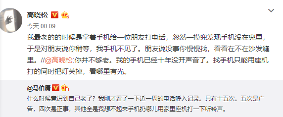 马伯骞写道:“什么时候意识到自己老了?我刚才看了一下近一周的电话呼入记录。只有十五次。五次是广告,四次是正事,其他全是我想不起来手机扔哪儿,然后用家里座机打一下听铃声。”稍晚,高晓松转发了该动态,他表示:“你并不够老。我的手机已经十年没开声音了。找手机只能用座机打的同时把灯关掉,看哪里有光。”
