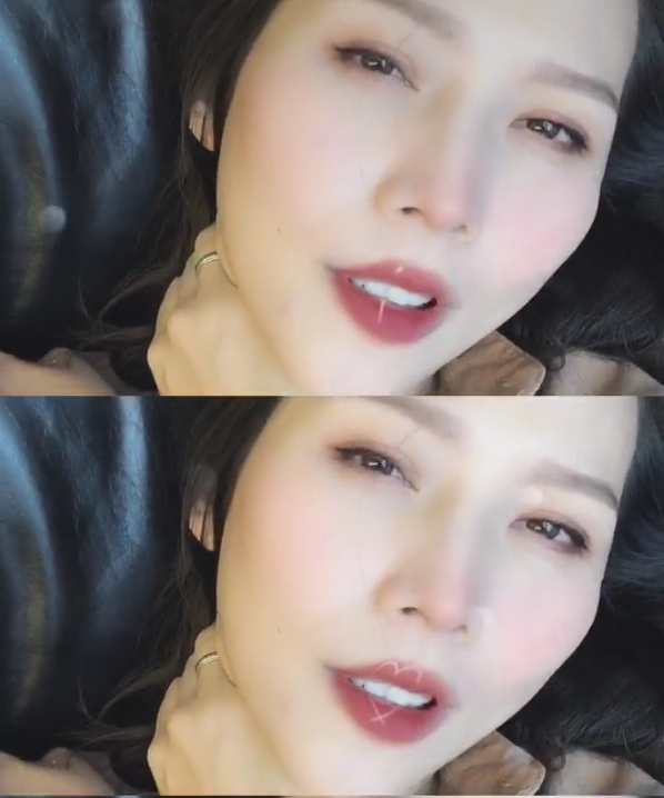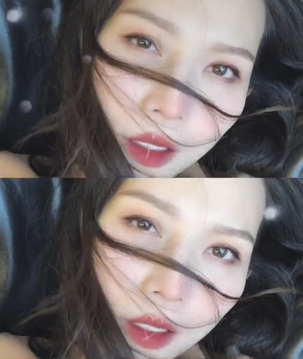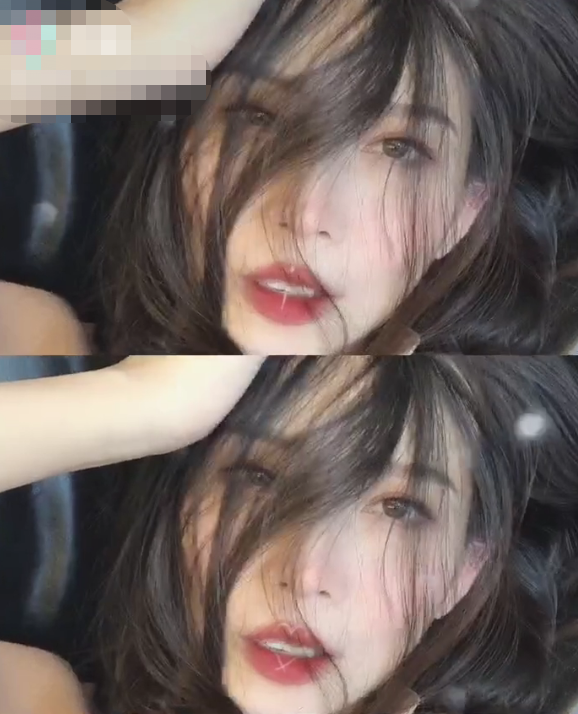 她面对镜头不时做着动作,撩发加上迷离的眼神十分魅惑,玻璃红唇迷人。