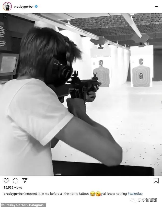 除了纹身,Presley还在ins上发布射击场开枪的黑白视频↓↓po文:无辜的小小的我, 你们啥也不懂。。。