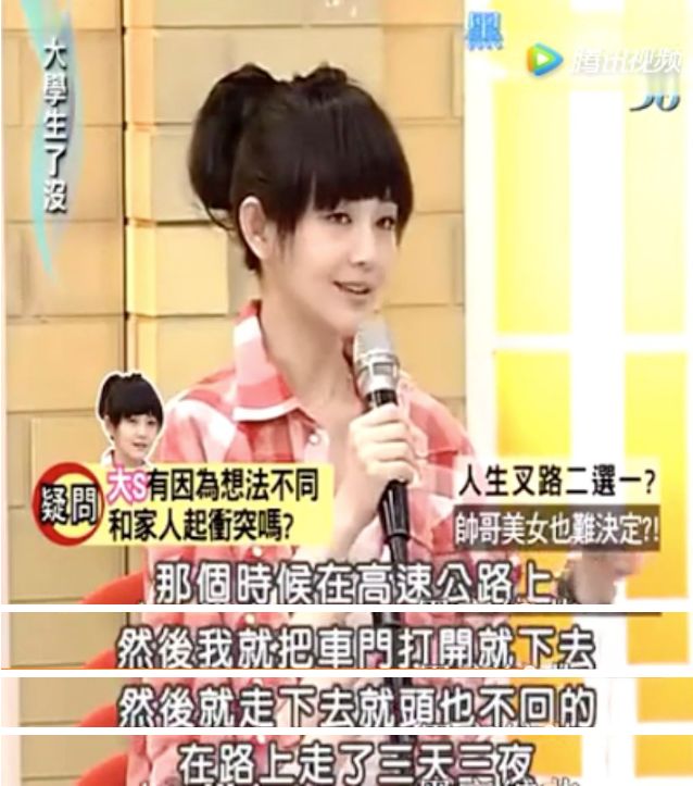 一次,两人在大马路上因为转学的问题又吵起来,大S越想越气,当车开到高架的时候,坐在副驾驶的她对徐妈妈撂下一句“我的人生为什么要由你来决定! ”直接打开车门跳了下去,在车流不息的高架桥上一个人跑了。