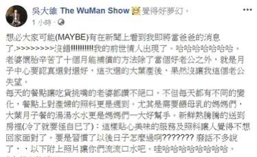 就在今日,吴大维公开了妻子诞下女儿的喜讯,他在社交平台上发文称,“想必大家可能有在新闻上看到我即将当爸爸的消息了。没错!我的前世情人出现了!”