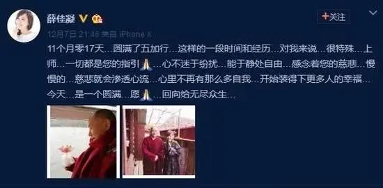 在2017年,还被曝出了带发修行了11个月零17天,圆满了五加行。(带发修行:是指在寺院过一段相对宁静的日子,一边整理、充实自己,边修学佛法、积福积德。)