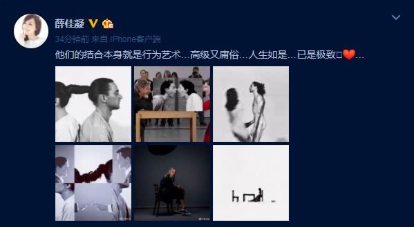 而随着事情的不断发酵,薛佳凝3月3日还在微博上晒出了一组照片,并配文:“他们的结合本身就是行为艺术…高级又庸俗…人生如是…已是极致”,疑似回应自己的恋情传闻,而照片就是一对情侣的行为艺术。