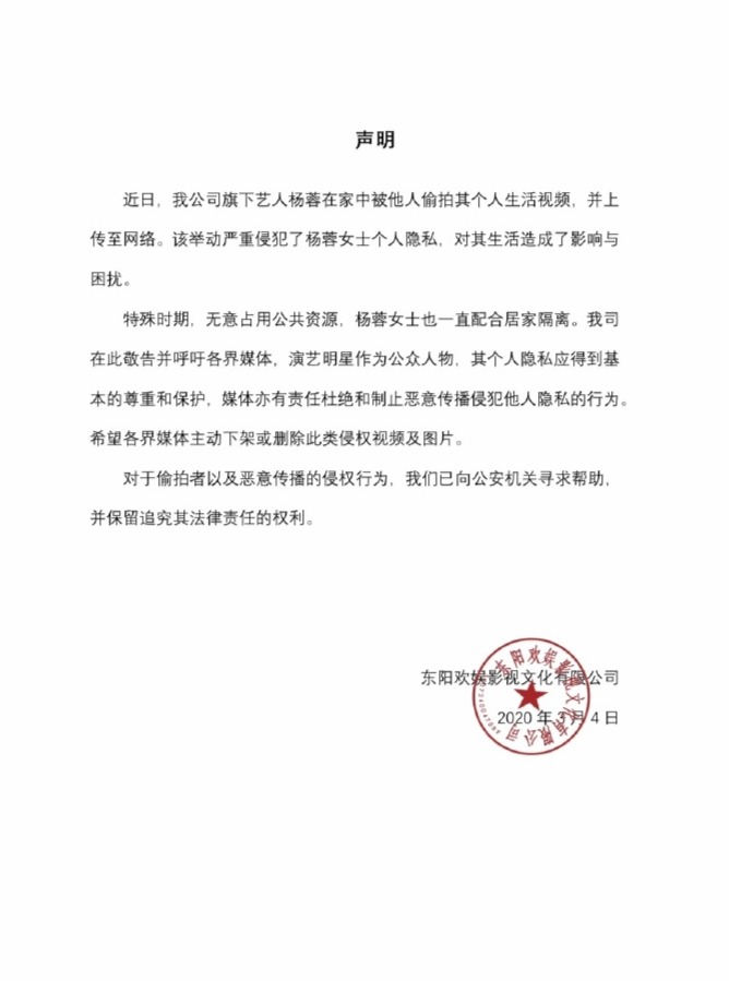 3月4日,欢娱影视在社交平台发布声明,就旗下艺人杨蓉在家中被偷拍视频一事进行回应。