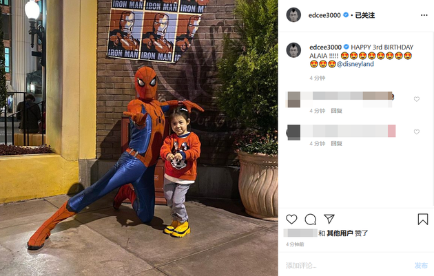 3月4日是陈冠希女儿Alaia的三岁生日,当天,陈冠希在个人社交网站晒出一张Alaia与“蜘蛛侠”的合照,并发文为女儿庆生。