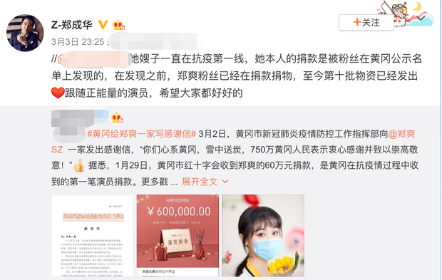 据悉,1月29日,黄冈市红十字会收到郑爽的60万元捐款,是黄冈在抗疫情过程中收到的第一笔演员捐款。之后,黄冈市新冠肺炎疫情防控工作指挥部于3月2日向郑爽一家发出感谢信,“你们心系黄冈,雪中送炭,750万黄冈人民表示衷心感谢并致以崇高敬意!”