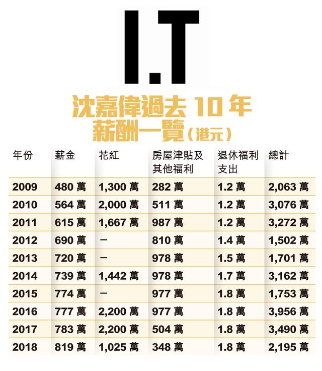 2015年集团业绩大跌三成,沈嘉伟和弟弟沈健伟因此还没有分红,不过二人仍拿着千万总年薪。据相关数据表明,沈嘉伟2017年总薪酬达到3490万元港币,前年因为分红大跌而有所影响,不过照样有2195万元港币。