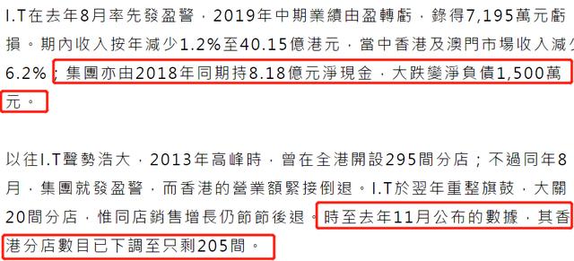 以往IT声势浩大,2013年高峰时在香港就开设了295件分店,不过同年8月,集团业绩就有所下降,隔年集团重整旗鼓,关闭了20家分店,但是营业额仍然节节后退,时至去年年底,其香港分店只剩下205家。