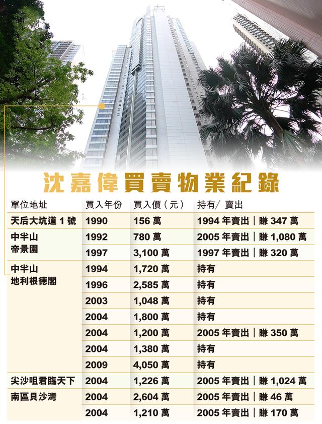 十分有经济头脑的沈嘉伟在90年代开始就疯狂扫楼,包括在1992年以780万港币买入的一处半山豪宅,于2005年以1860万港币卖出,持该物业13年赚了超过1000万元港币。之后他又陆续购买多套物业,选最好的时机转手卖出,现在其中有4套豪宅由家人使用,其余手中还持有两个物业,相信是用以长期收租。