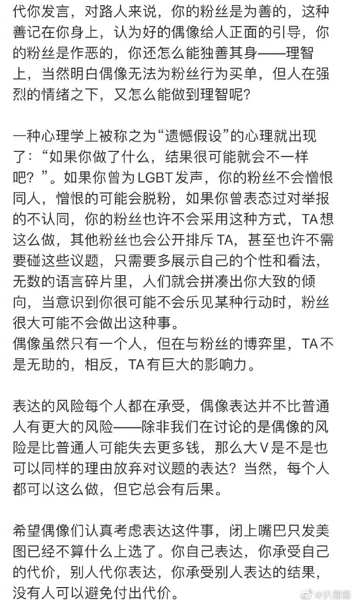 我们不能指望偶像“引导”,“发声”,做“榜样”,“管理”粉丝,或由理智粉掌握话语权,这个畸形的生态就能被修整好了。