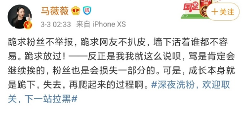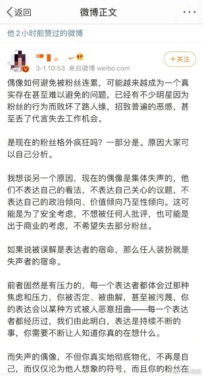 我们先说大众层面, 3月1日下面这篇内容被 大量转发, 博主的意思是明星应该要多表达立场,“任人装扮是失声者的宿命”▼▼▼