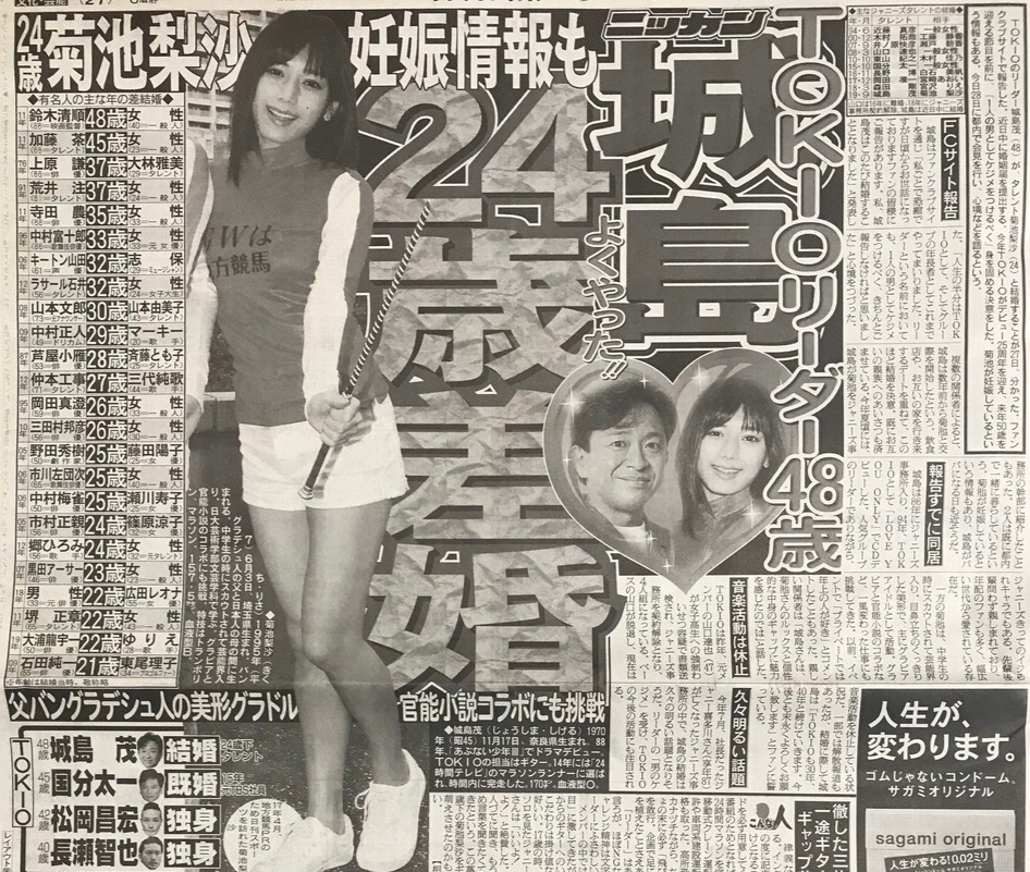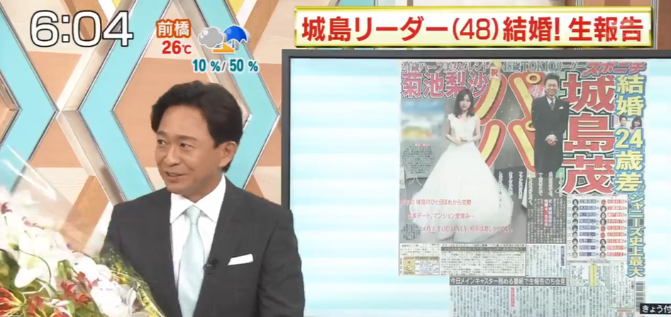 2019年9月28日,48岁的城岛茂通过官方粉丝俱乐部宣布与小24岁的写真女星菊池梨沙结婚,宣布妻子已经怀孕,并且在朝日电视台早间节目“周刊新闻leader\"的现场再次报告了结婚的消息。